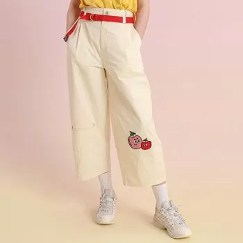 High-Waist Cotton Capris with Cartoon Fruit Embroidery