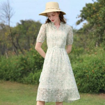 Green Floral Chiffon V-Neck Summer Dress – A-Line Tea Dress with Puff Sleeves