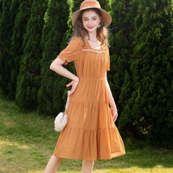 Chic Square Neck Puff Sleeve Summer Dress – Elegant Mid-Calf A-Line Style