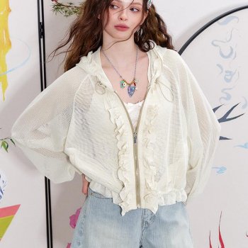 Spring White Hooded Pleated Jacket with Hollow Design for Women