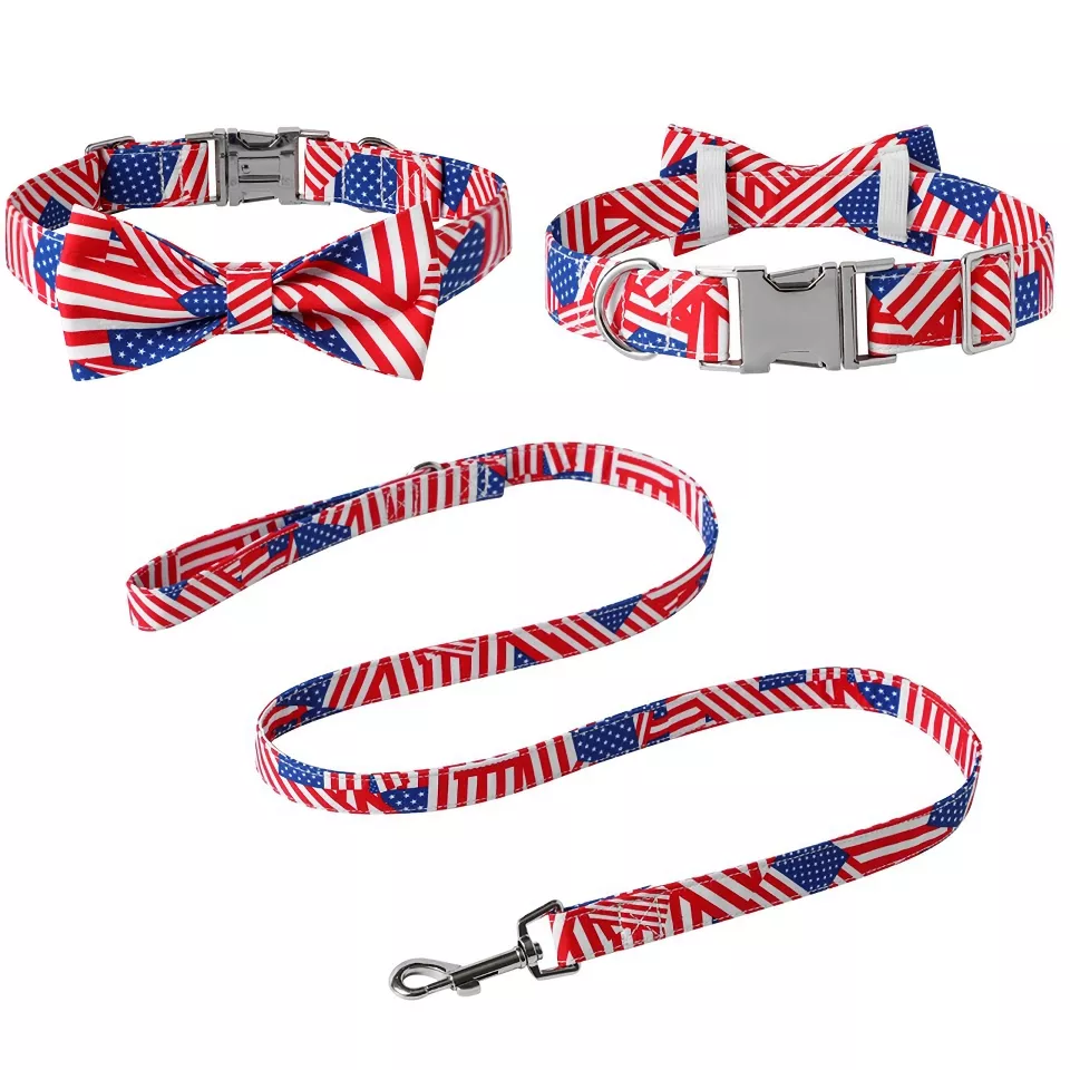 The American Flag Dog Collar and Leash Set is crafted from high-quality polyester and durable metal. The set includes: