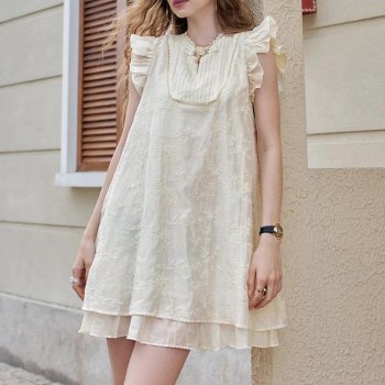 Summer New Arrivals Embroidered Apricot Small Fly Sleeves Loose Casual Dress For Women