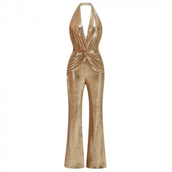 Women’s Gold Sequin V-Neck Wide Leg Jumpsuit